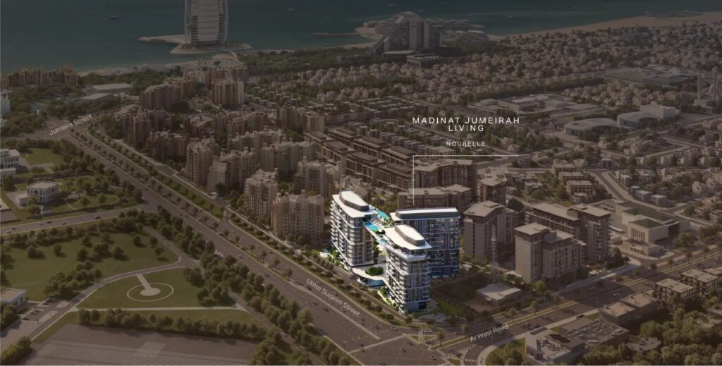 Nourelle At MJL Three contemporary buildings connected by a skybridge, offering 1-4 BR apartments with city skyline views.